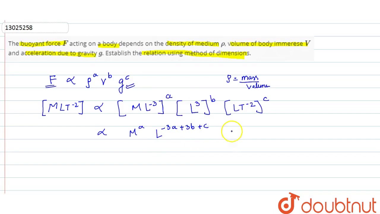 The Buoyant Force F Acting On A Body Depends On The Density Of Medium Rho Volume Of Body Youtube